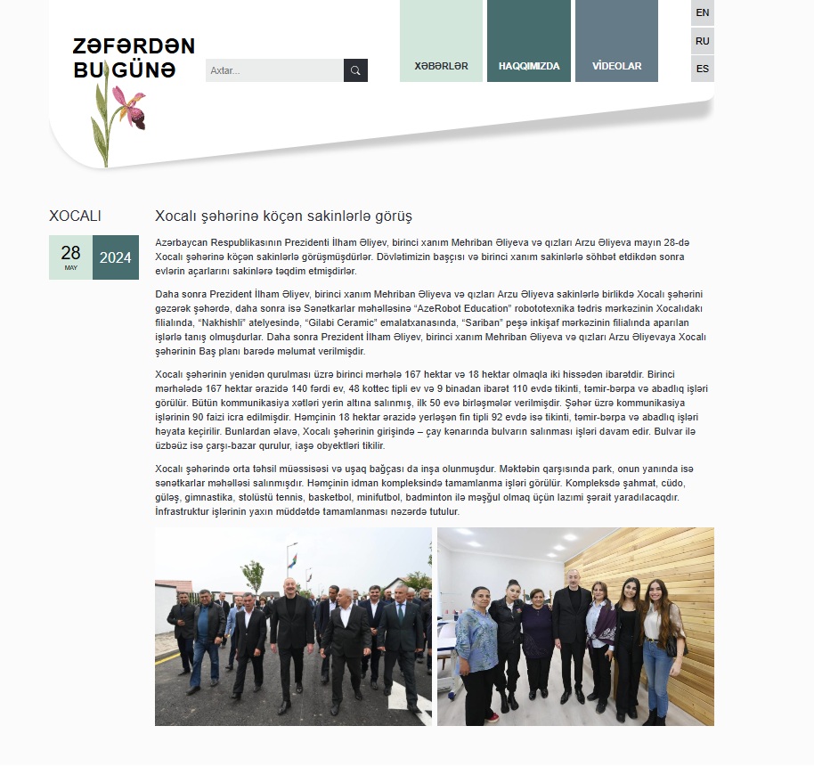 Azərbaycan, rus, ingilis və ispan dili olmaqla 4 dildə hazırlanmış “Zəfərdən bu günə” portalı işğaldan azad edilmiş ərazilərimizdə gedən dirçəliş prosesi ilə bağlı rəsmi xronikanı özündə əks etdirir.